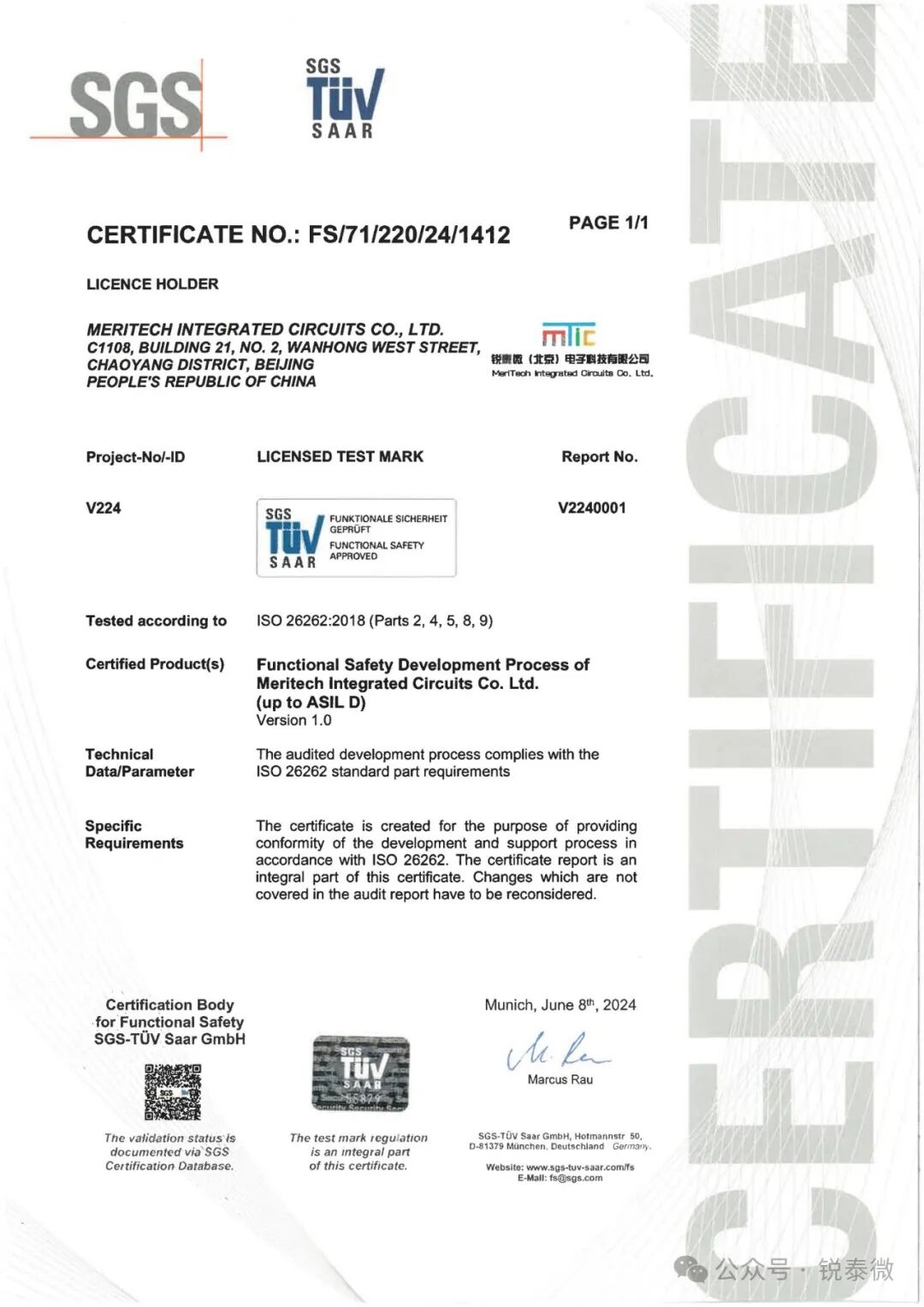 2024年6月18日,国际公认的测试、检验和认证机构SGS(以下简称为“SGS”)为锐泰微(北京)电子科技有限公司(以下简称“锐泰微”)颁发了ISO 26262:2018功能安全ASIL D流程认证证书。获得此证书标志着锐泰微的功能安全开发流程已经按照ISO 26262:2018版标准要求,建立起符合最高等级“ASIL D”级别的功能安全产品开发和管理流程体系。