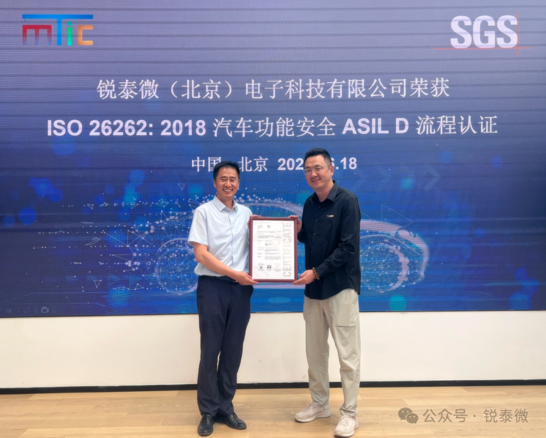 经过SGS的独立审核,锐泰微构建的功能安全标准开发流程符合ISO 26262:2018 标准要求,获颁功能安全ASIL D流程认证证书,此举将为锐泰微未来的功能安全产品开发和认证奠定坚实基础。