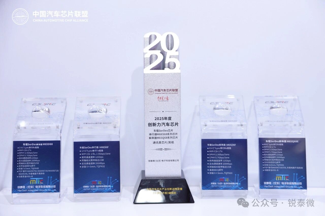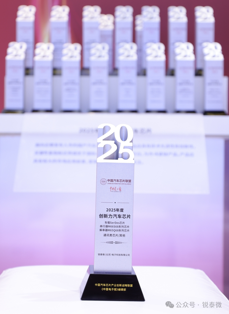 2025 年 4 月 25 日下午,"2025 中国汽车芯片产业创新成果" 颁奖仪式在 2025 上海国际车展 "中国芯" 展区隆重举行。本次活动由中国汽车芯片产业创新战略联盟携手中国电子报共同主办,吸引了来自北京、上海、广州、深圳、苏州、无锡、重庆等全国多地的 104 个项目踊跃参与创新成果申报。经过严格评审,锐泰微凭借C³ Lync SerDes芯片系列-串行器M66S68芯片及解串器M65Q68芯片,从众多优秀项目中脱颖而出,一举斩获 2025 年度创新力汽车芯片奖。该奖项旨在表彰技术领先、创新突出的汽车芯片产品,要求获奖产品不仅在关键性能指标上达到或超越国际先进水平,填补国内技术空白,同时还需具备广阔的市场应用前景,得到下游客户的高度认可。